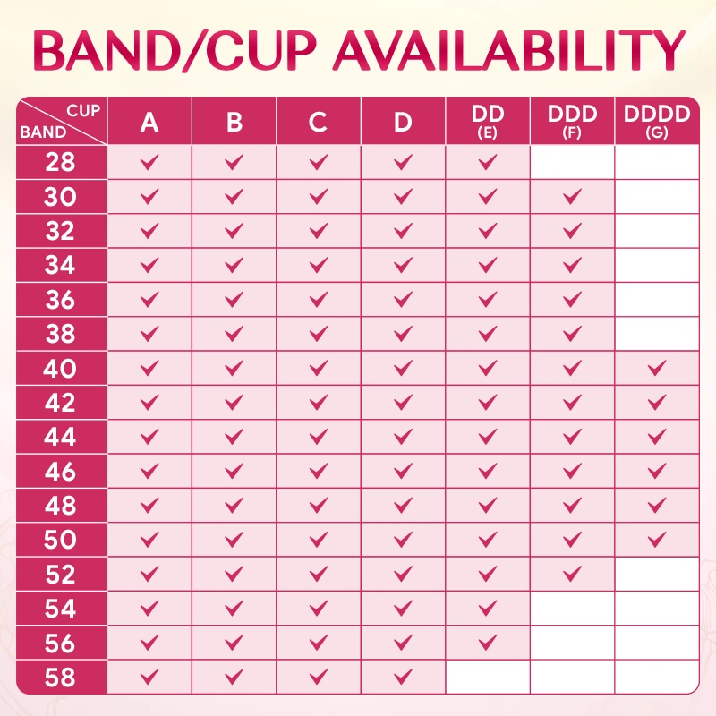 From Cup A to G! Our top lingerie designer's meticulous size chart, combined with our flexible fabric, promises the fit you desire.